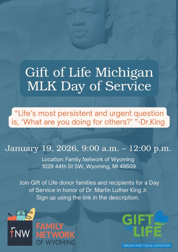 We're inviting all donor families, recipients, and community members to join us for a day of service in honor of Dr. Martin Luther King Jr. This event will take place on January 19th from 9 a.m. to 12 p.m., and volunteers are welcome to stay longer if they'd like.