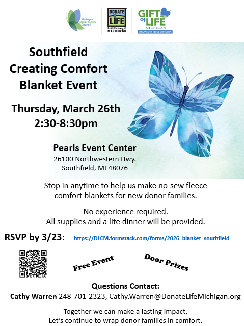 On March 26th Gift of Life Michigan along with Donate Life Coalition of Michigan will be hosting a comfort blanket event at the Pearls event center in Southfield, Michigan.